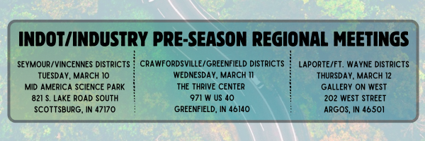 INDOT Division of Materials & Tests have scheduled three regional joint preseason Aggregate, HMA and concrete meetings, scheduled for March 10-12. The meetings will provide a forum to present changes and updates to Aggregate, HMA programs, and the concrete program and procedures for the coming year and allow all in attendance to ask questions and get on the same page before the season starts. Please feel free to invite anyone in your organization who could benefit from attending. If you can’t attend the meeting in your region, feel free to attend either of the other meetings.