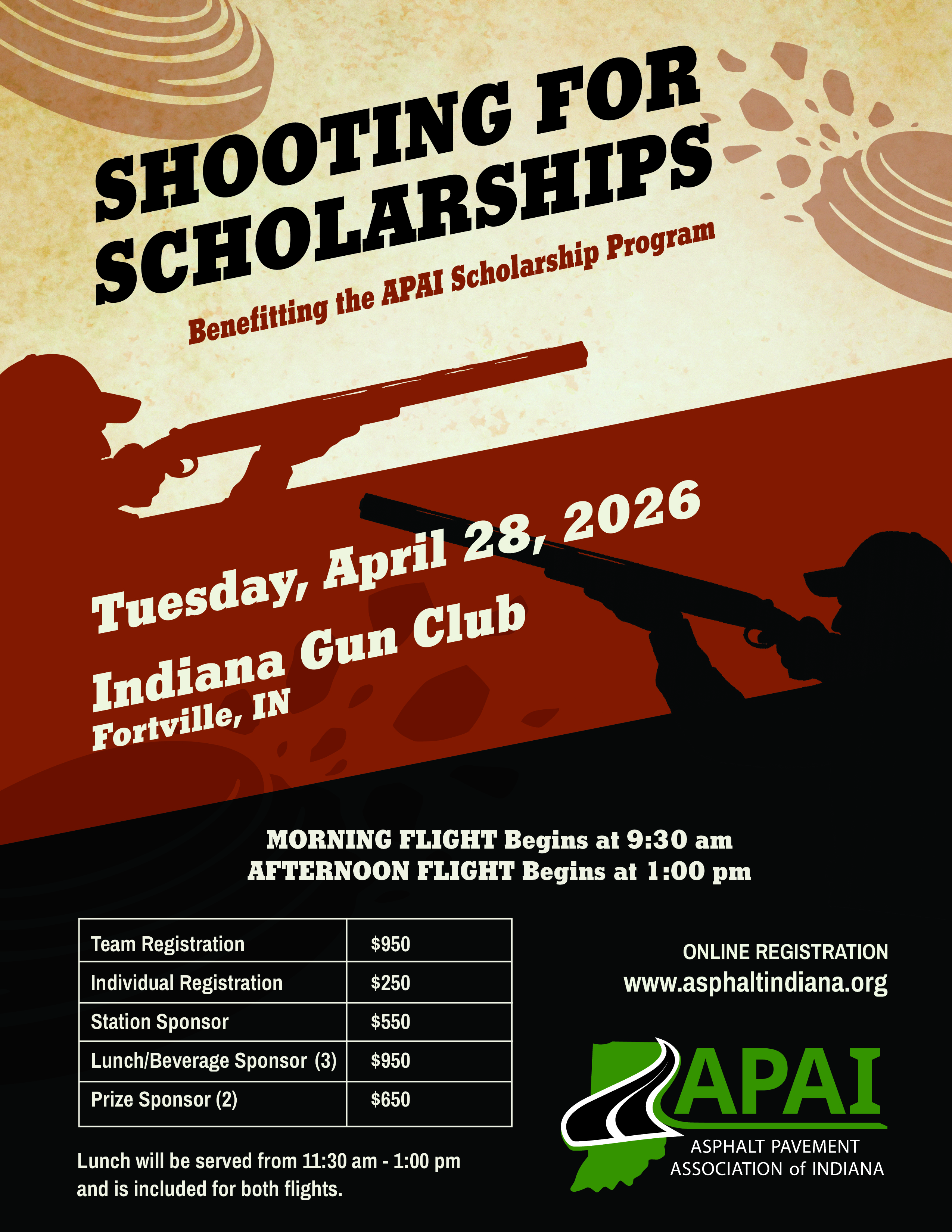 The 2026 APAI Shooting for Scholarships Clay Shoot fundraiser is scheduled for Tuesday, April 28th, 2026 at the Indiana Gun Club in Fortville. You don't want to miss this fun day, which serves as one of APAI's most well-attended networking events! 100% of the funds raised are allocated directly to the APAI Scholarship Program, which provides scholarships for construction management and civil engineering students at six Indiana universities.